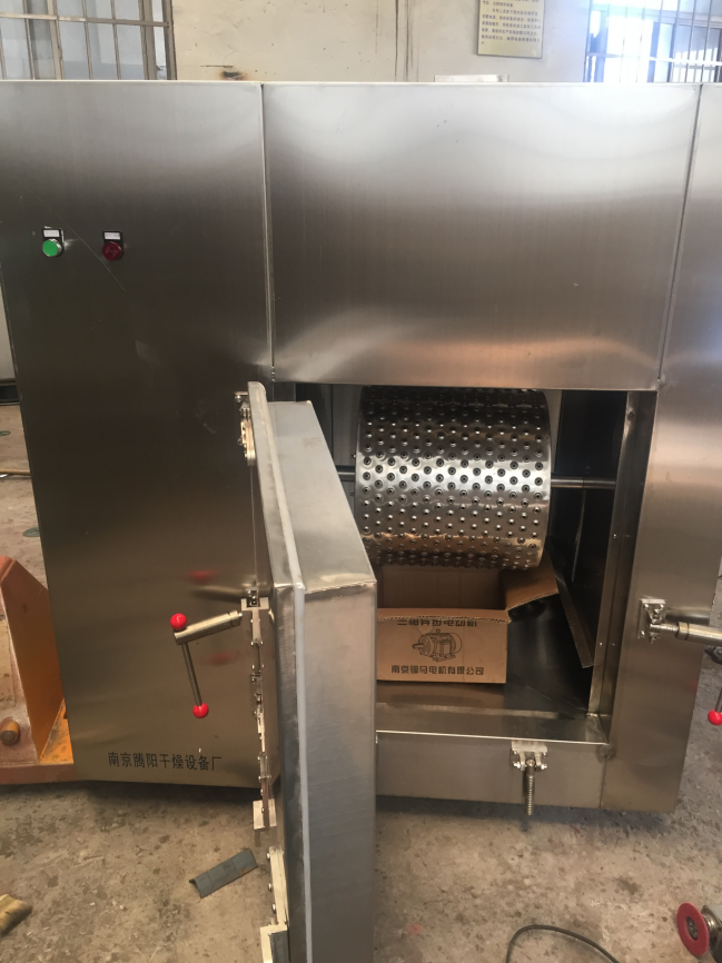 5、该烘箱内设不锈钢转筒,使所需烘干的物件在不断运转过程中均匀烘干。整体烘箱为全不锈钢制作,转筒采用凸凹型模具冲孔,不会磨损胶塞,在加热烘干过程中产生的水蒸汽顺着孔眼散发到烘箱室内,再由烘箱排湿口排出箱外。